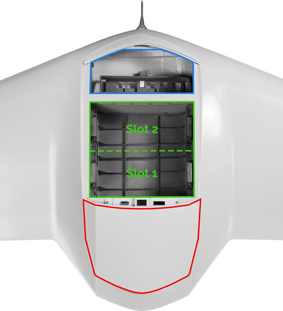 The auxiliary battery payload box must always be installed in Payload Slot 1, located at the rear end of the fuselage, as it is the heaviest payload.