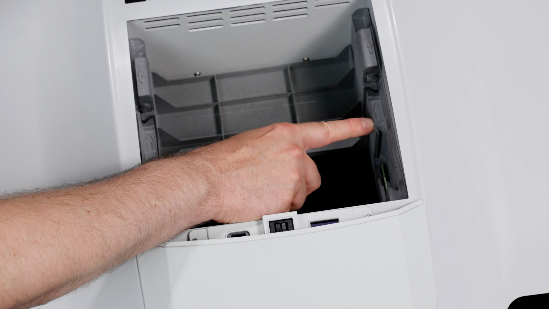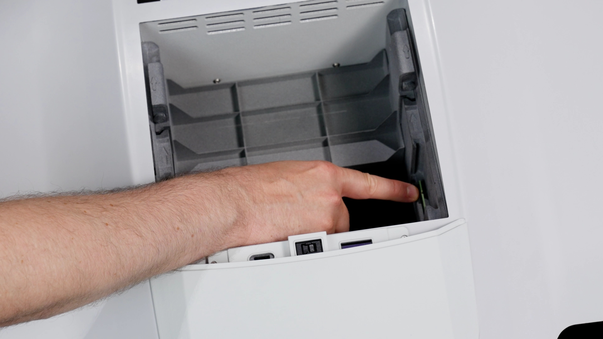 Push both handles of the payload box down until you hear a click from the locking mechanism, ensuring that the box is securely seated in its slot.