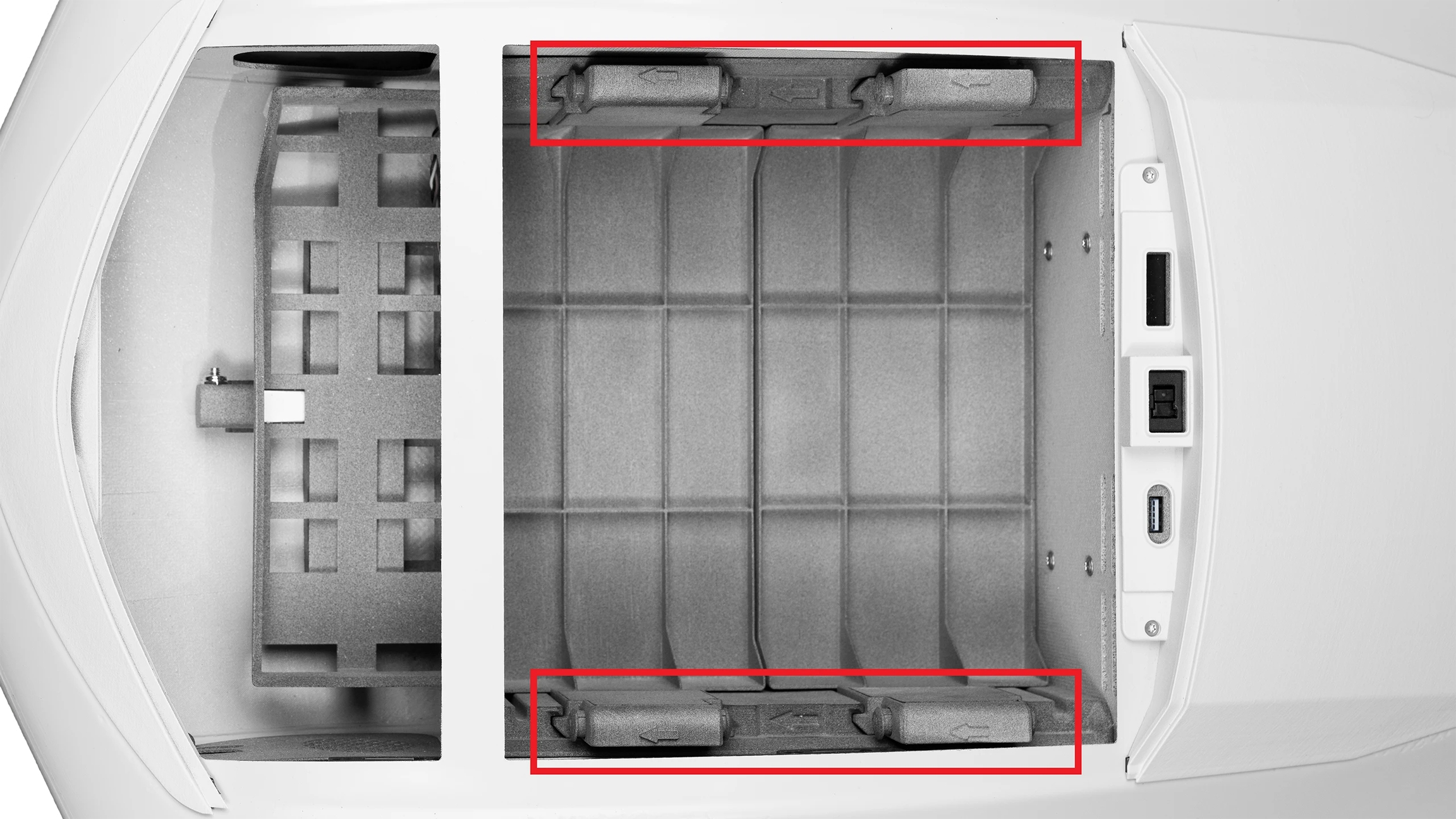 Each payload box has handles with two locking pins positioned opposite each other. To remove the payload box, grasp the handles with both hands, press the locking pins inward, and pull the payload box out.