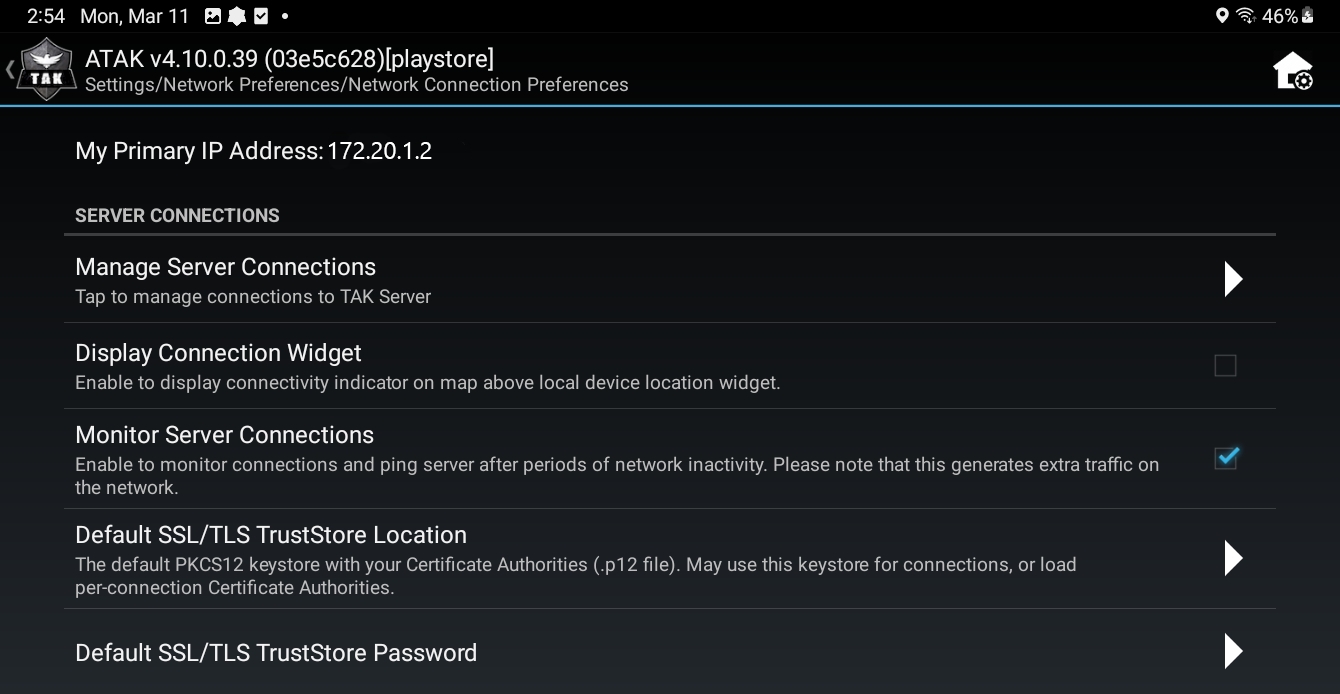 In ATAK, click on the three dots in the top right. A menu will appear. Click on Settings and then Network Connections. A popup will appear. Click on Network Connections. Check that the Primary IP Address is in the range 172.20.XX.XX.