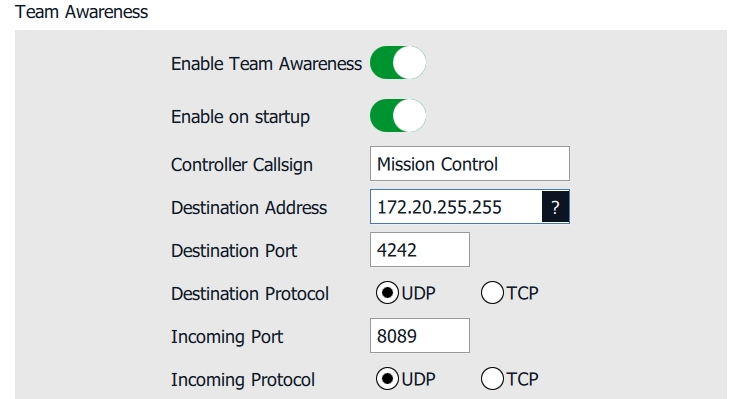 Turn on Enable Team Awareness and Enable on startup. In Fly View, the Team icon will be highlighted in blue, indicating that ATAK functionality is enabled.