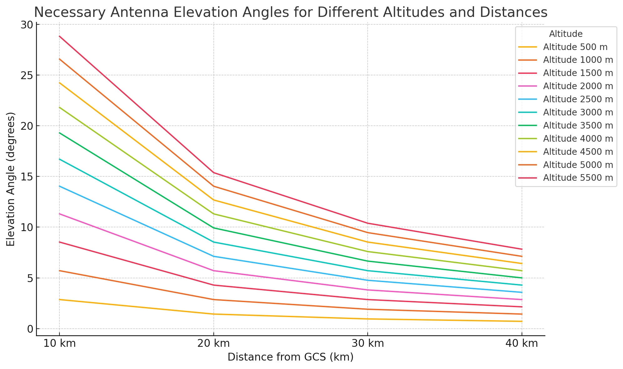 The following is a graph representing the necessary antenna elevation angles for different altitudes and distances from the GCS. The x-axis shows the distance from the GCS, and the y-axis shows the corresponding elevation angles in degrees for various altitudes ranging from 500m to 5500m. Each line represents a specific altitude and shows how the required elevation angle changes as the UAV moves farther from the GCS.