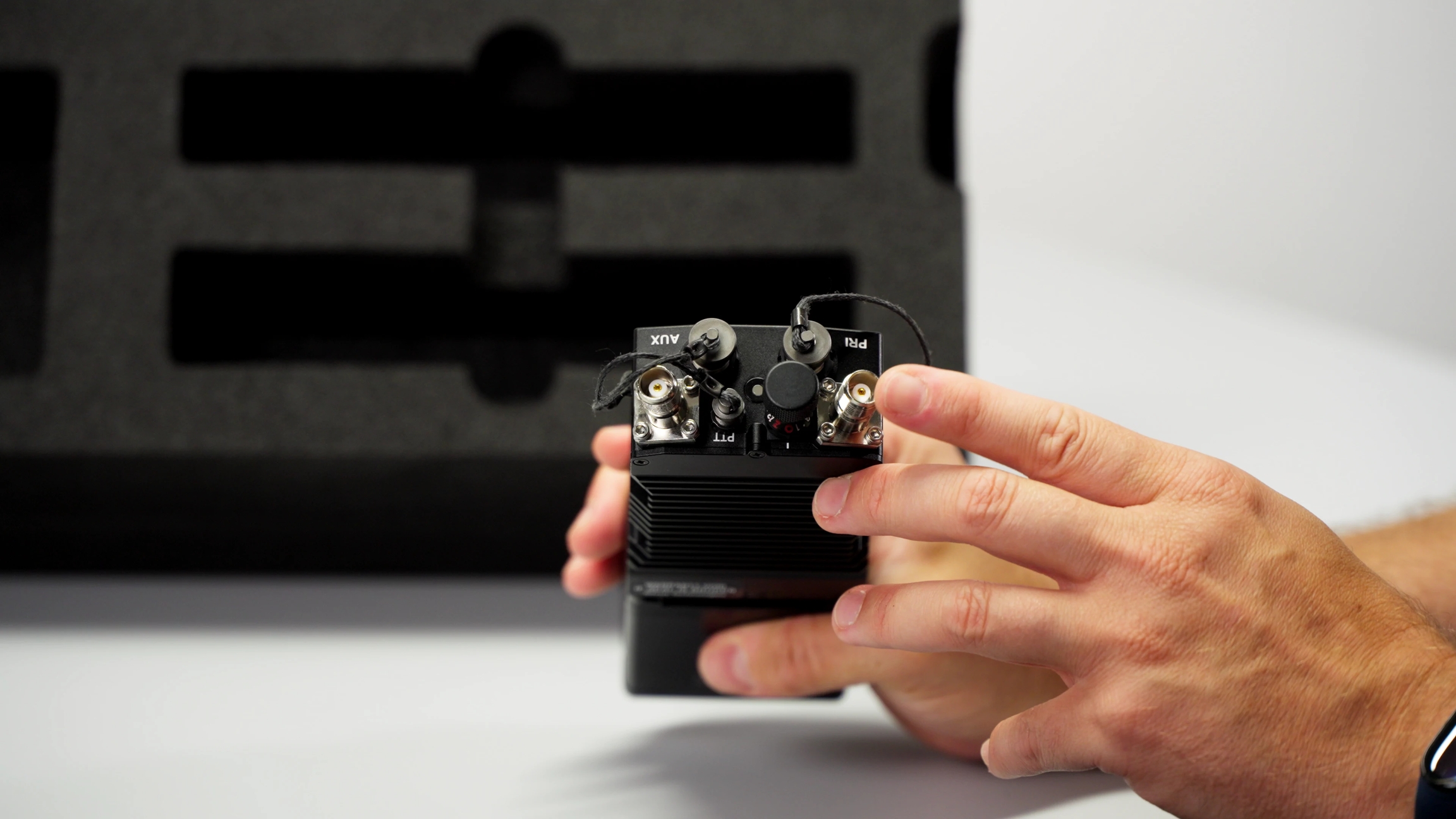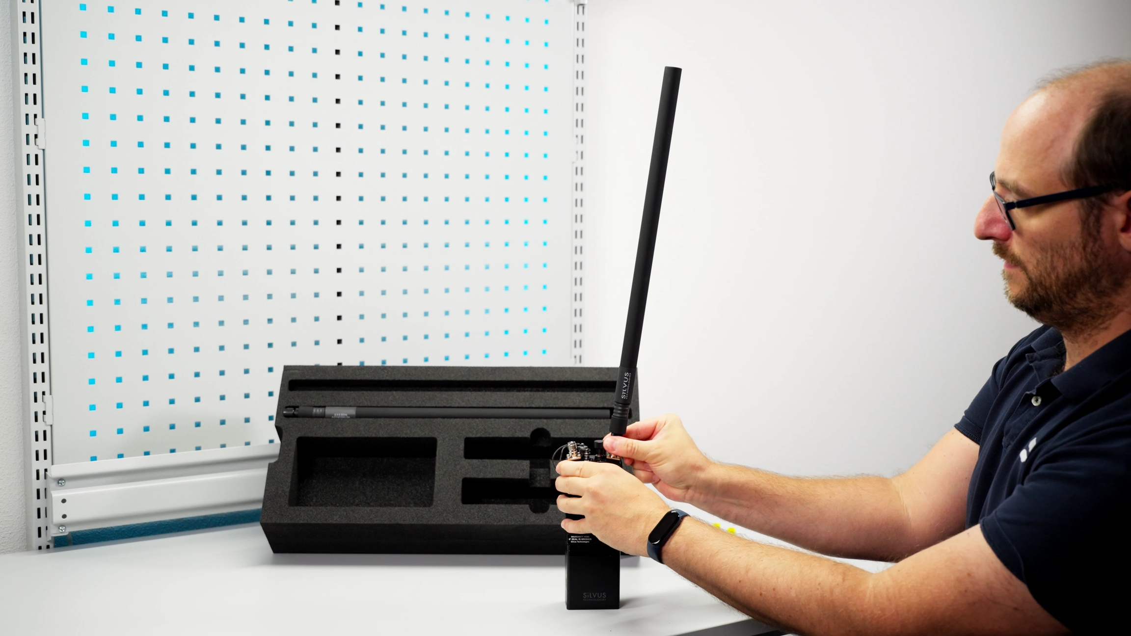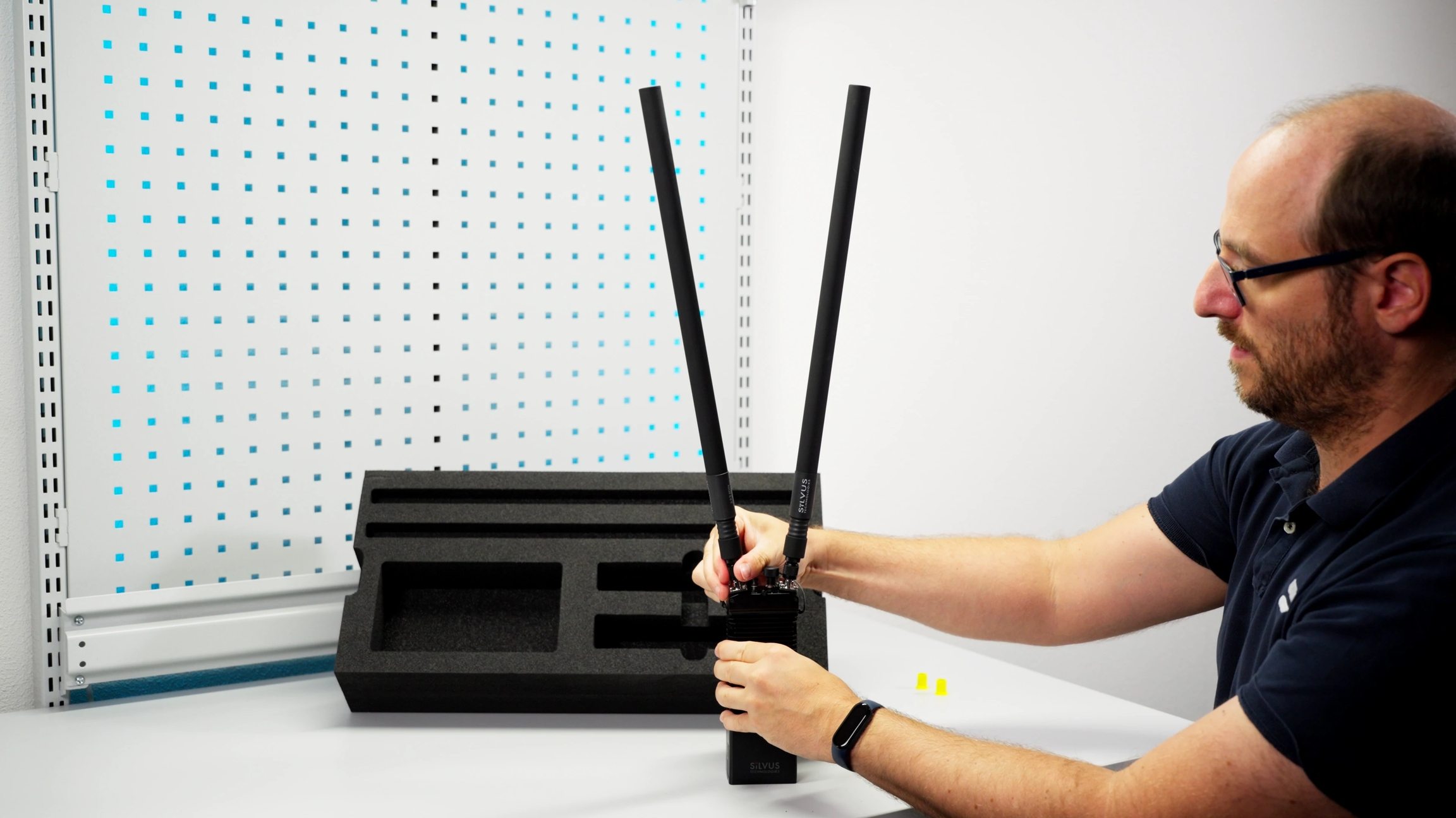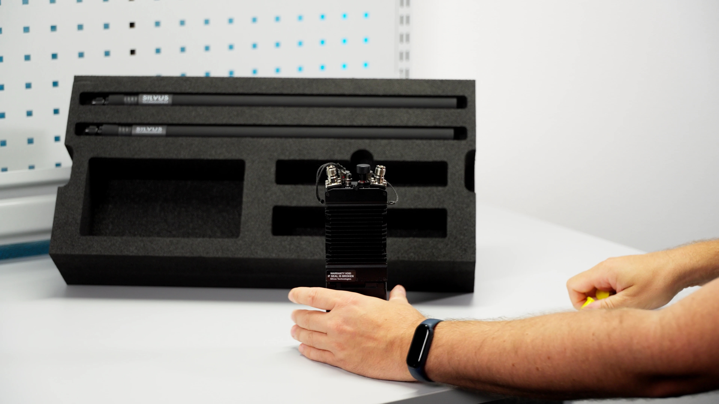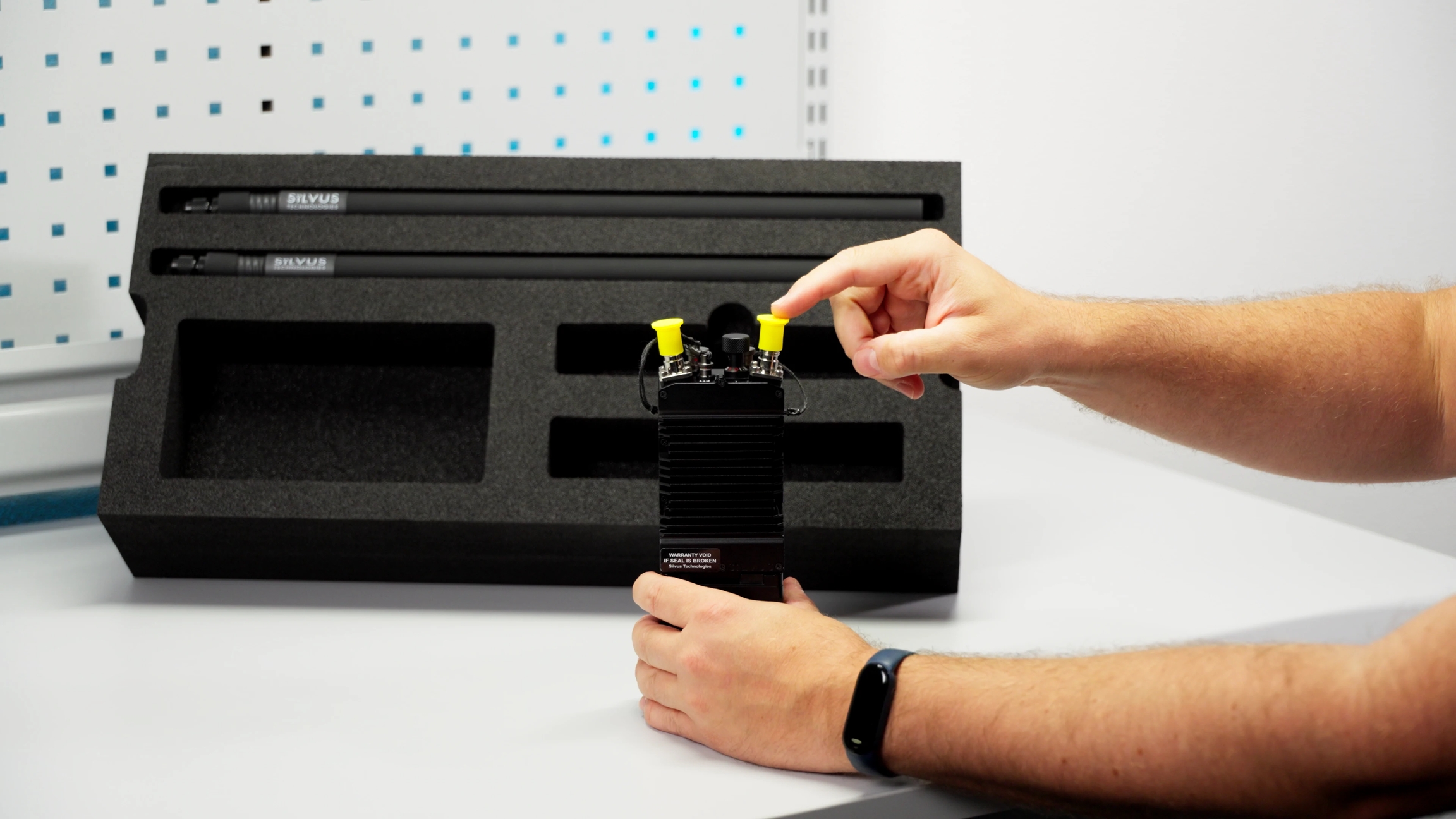 Remove the Silvus antennas from the upper right compartment of the flight case, and connect the two antennas to the RF ports (G).