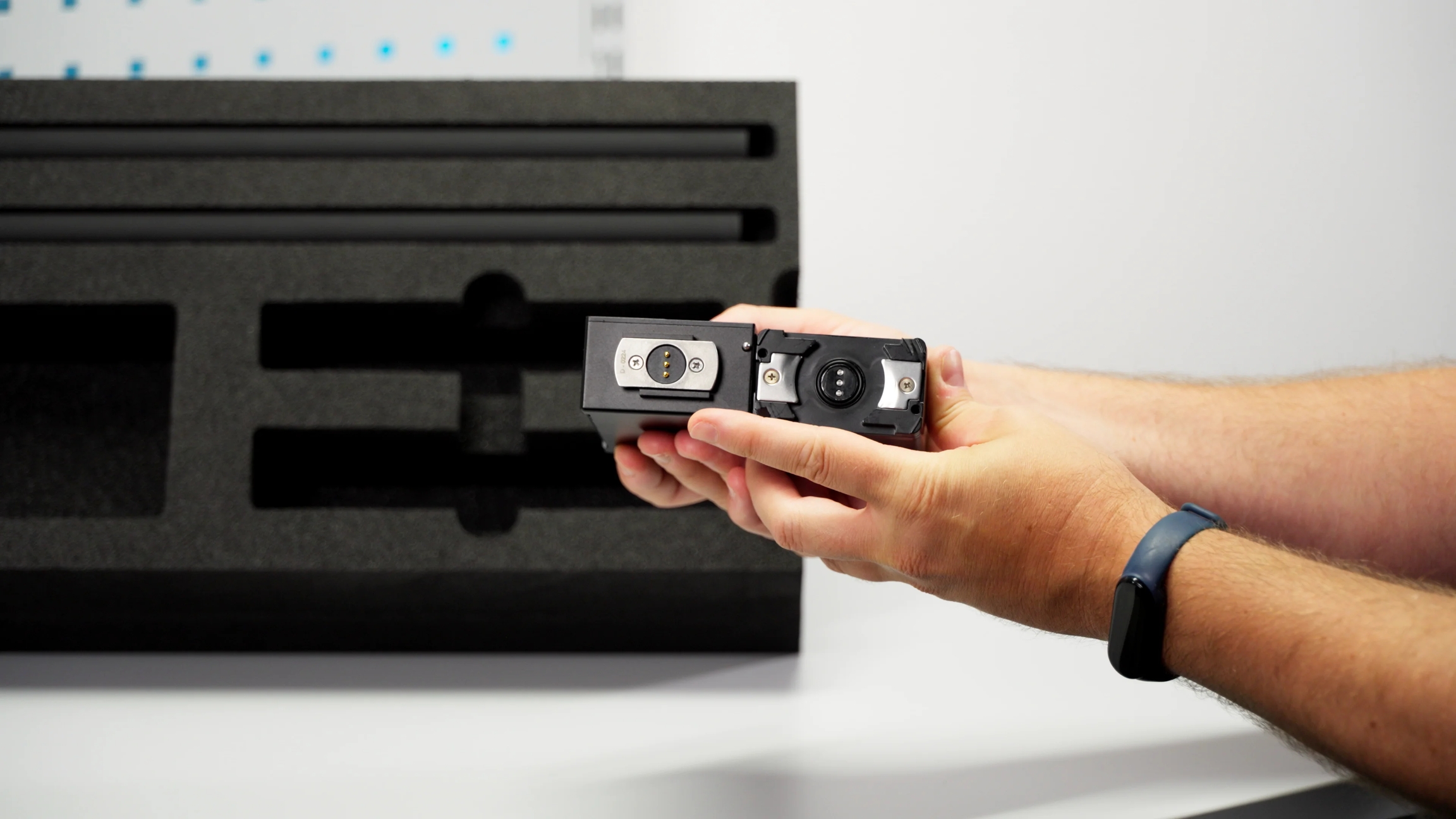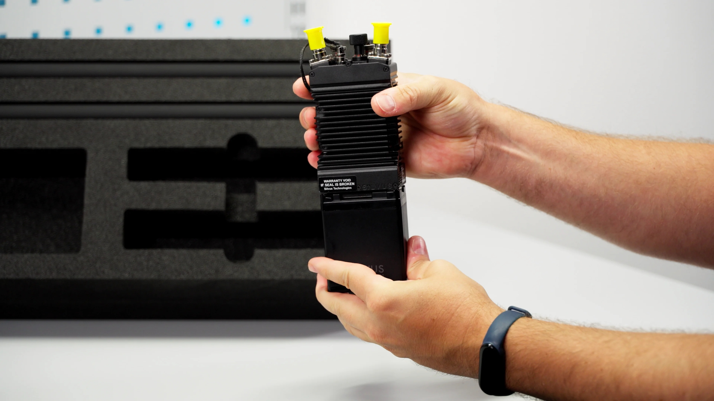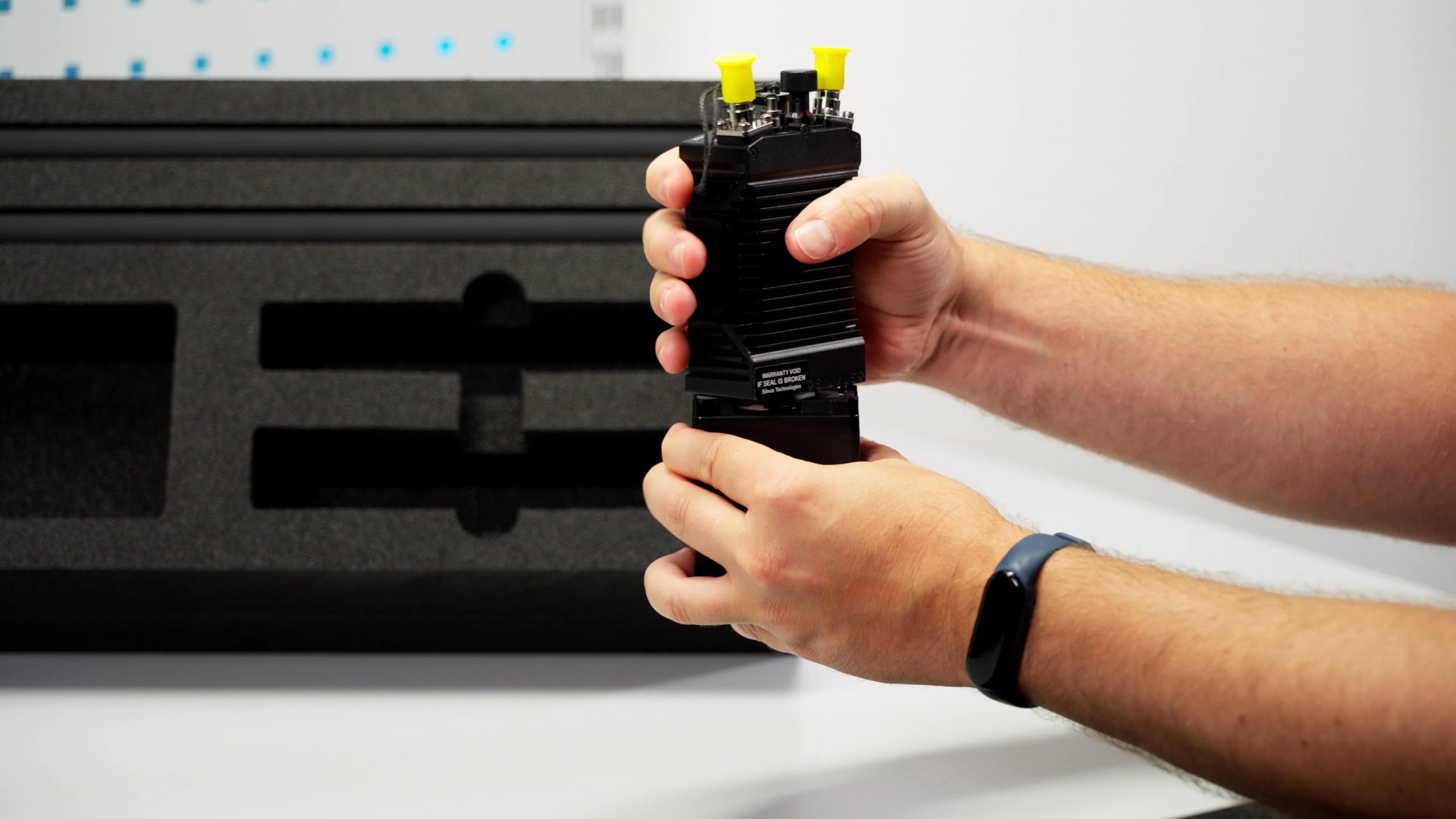 Take the Silvus StreamCaster 4240-EP and the Silvus battery out of the upper right compartment of the flight case.