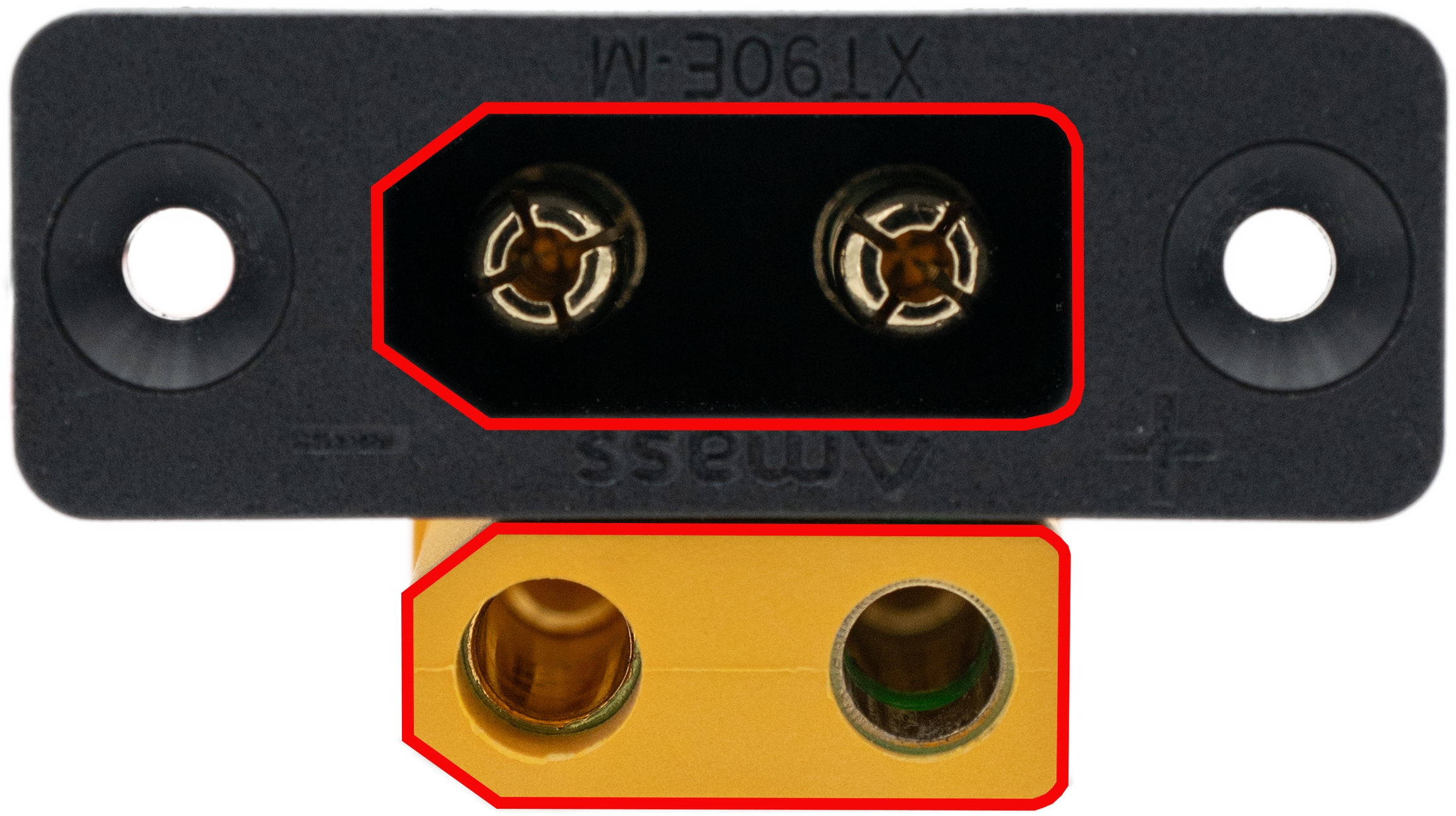 The XT90 connector and socket have key features that facilitate easy identification and proper alignment during connection. The interlocking shapes at the ends of the connector and socket must align to ensure correct placement. This design ensures that the connectors can only be plugged in one way.