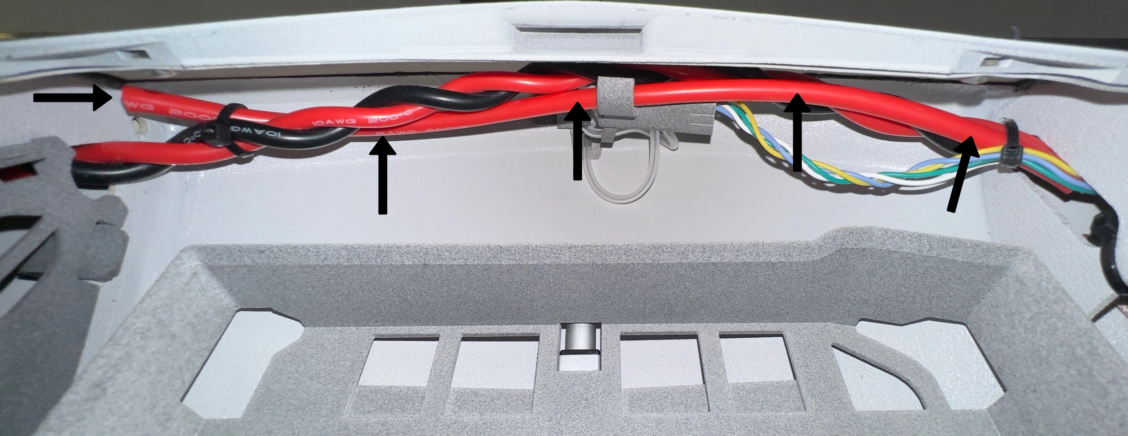As the Silvus air unit and the hardened GPS add extra weight, a counterweight in the nose is required to balance the vehicle. This is achieved using a short cable, zip-tied to the power loom in the battery compartment of the vehicle.