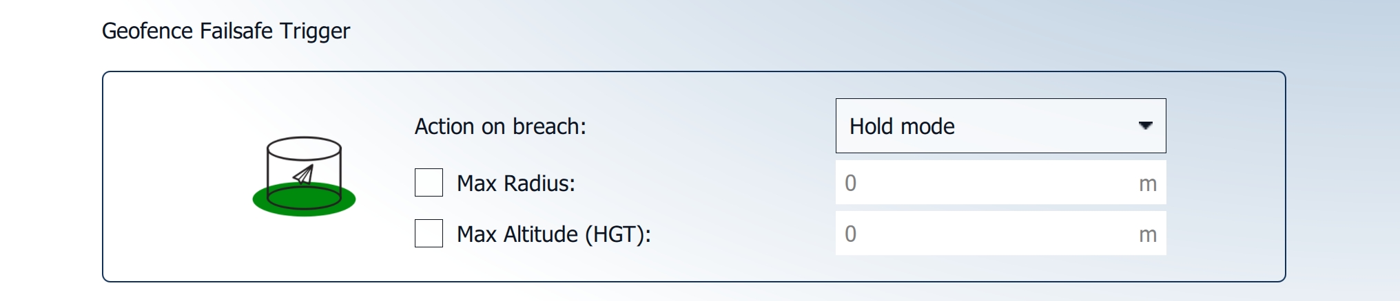 The Geofence Failsafe Trigger can be set to limit the vehicle's radius and/or altitude. When these parameters are breached, the vehicle will perform the defined action.