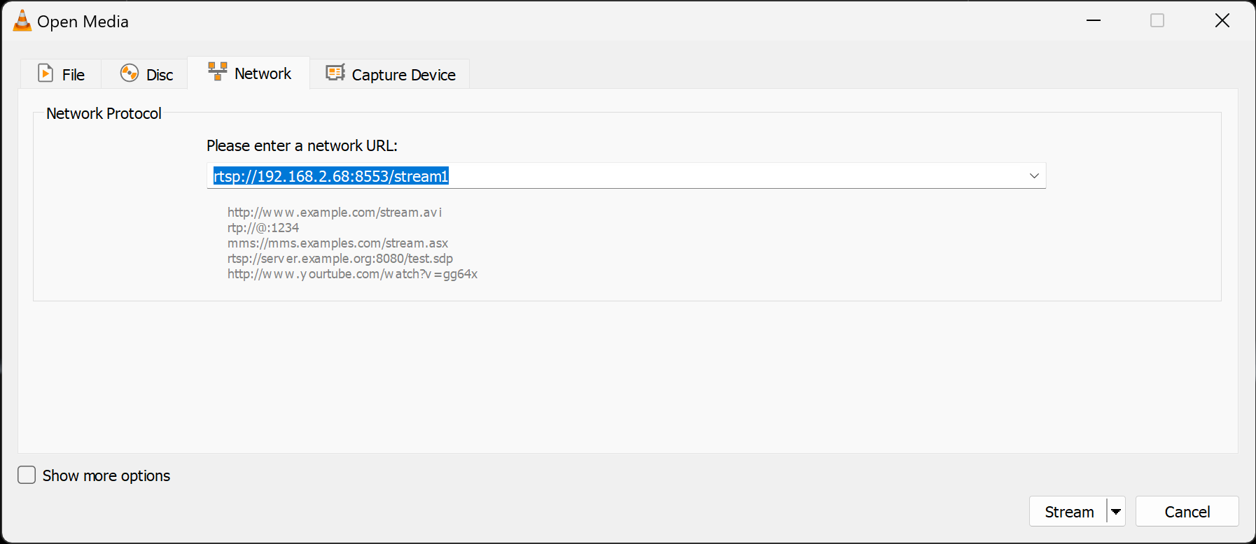 In our example, it is rtsp://192.168.2.68:8553/stream1.