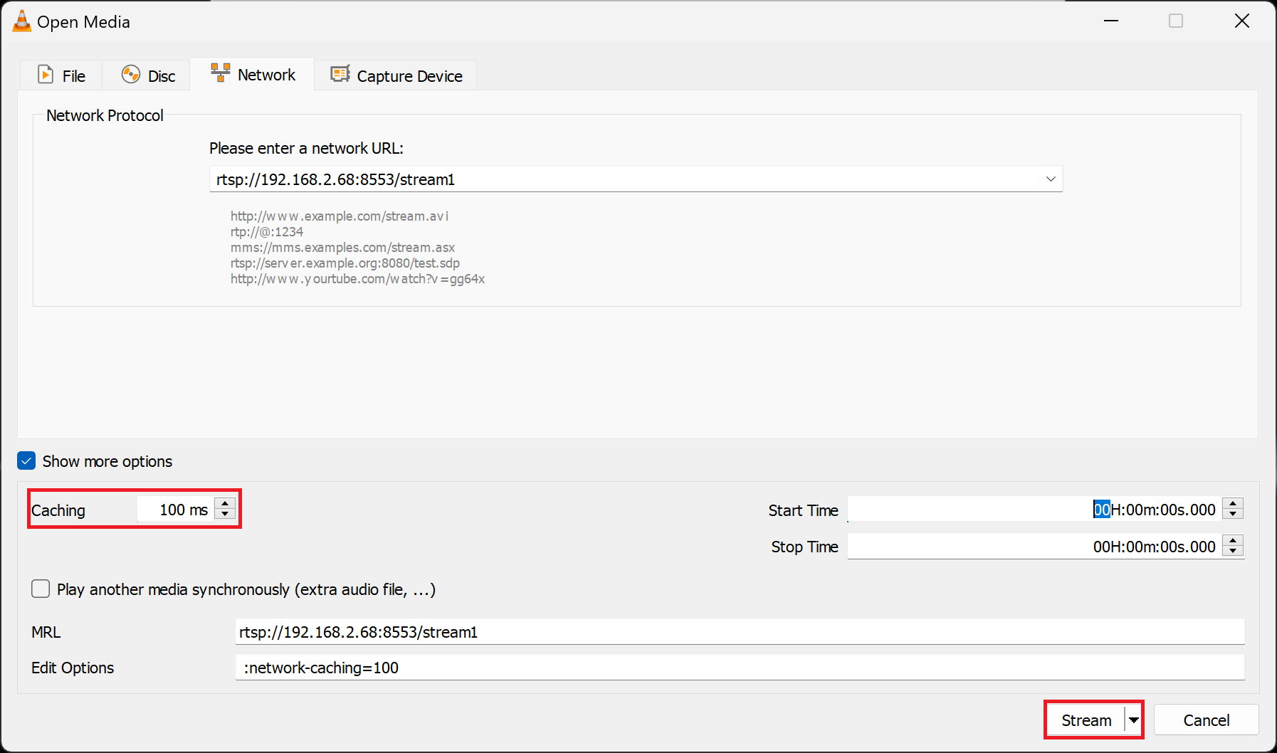 Check "Show more options" and set the value for "Caching" to 100ms. Click on "Stream" in the lower right corner of the window.