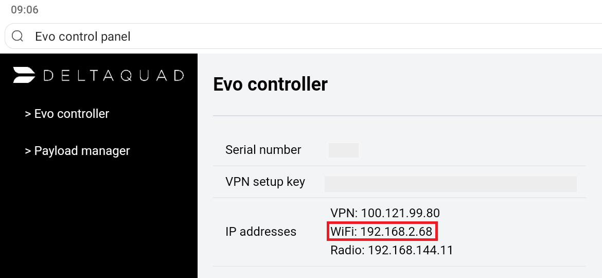 Once the DeltaQuad Controller is connected to the Wi-Fi network or hotspot you can determine the "Wi-Fi IP address" that was assigned to the DeltaQuad Controller by opening the Evo Control Panel.