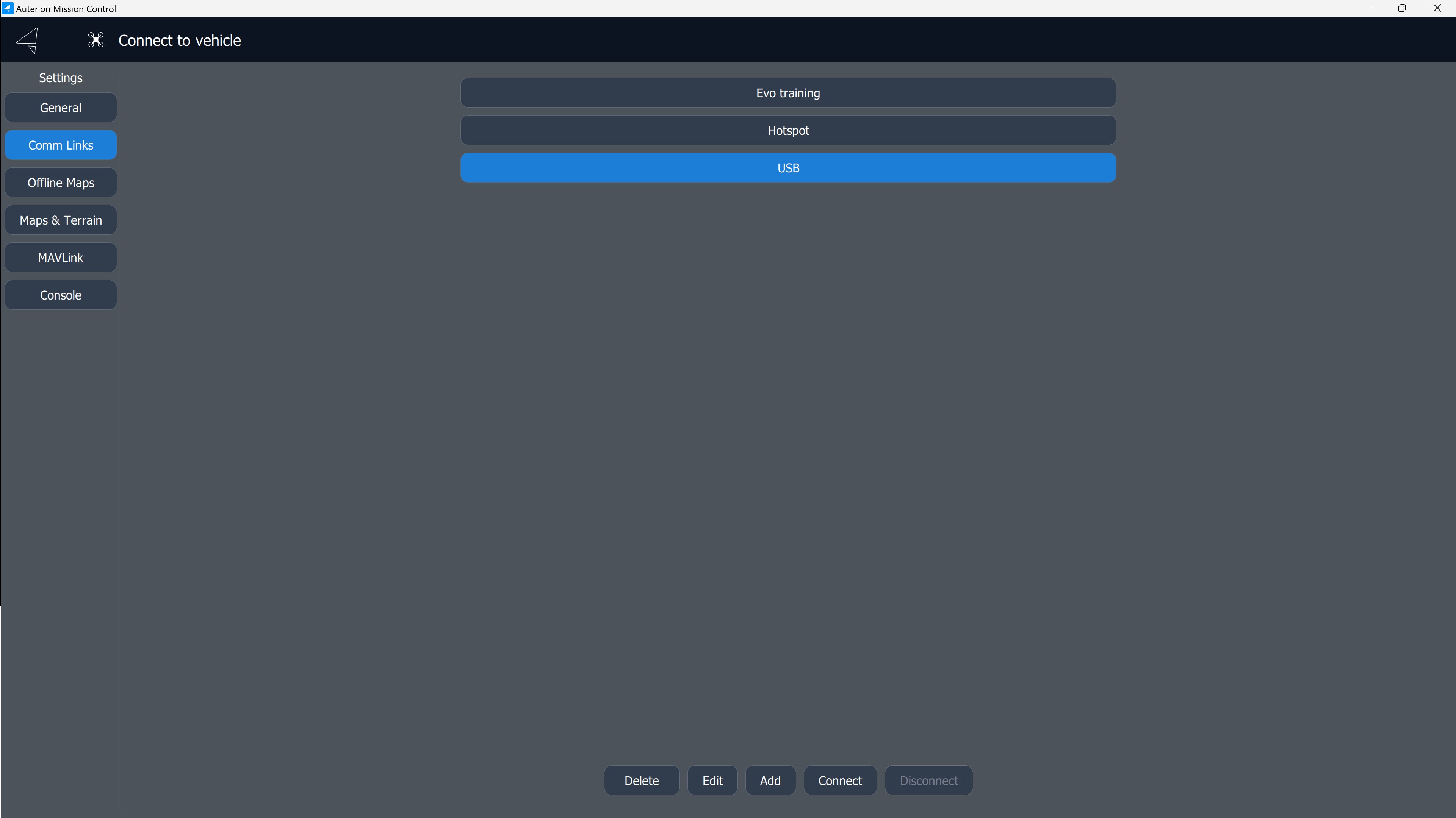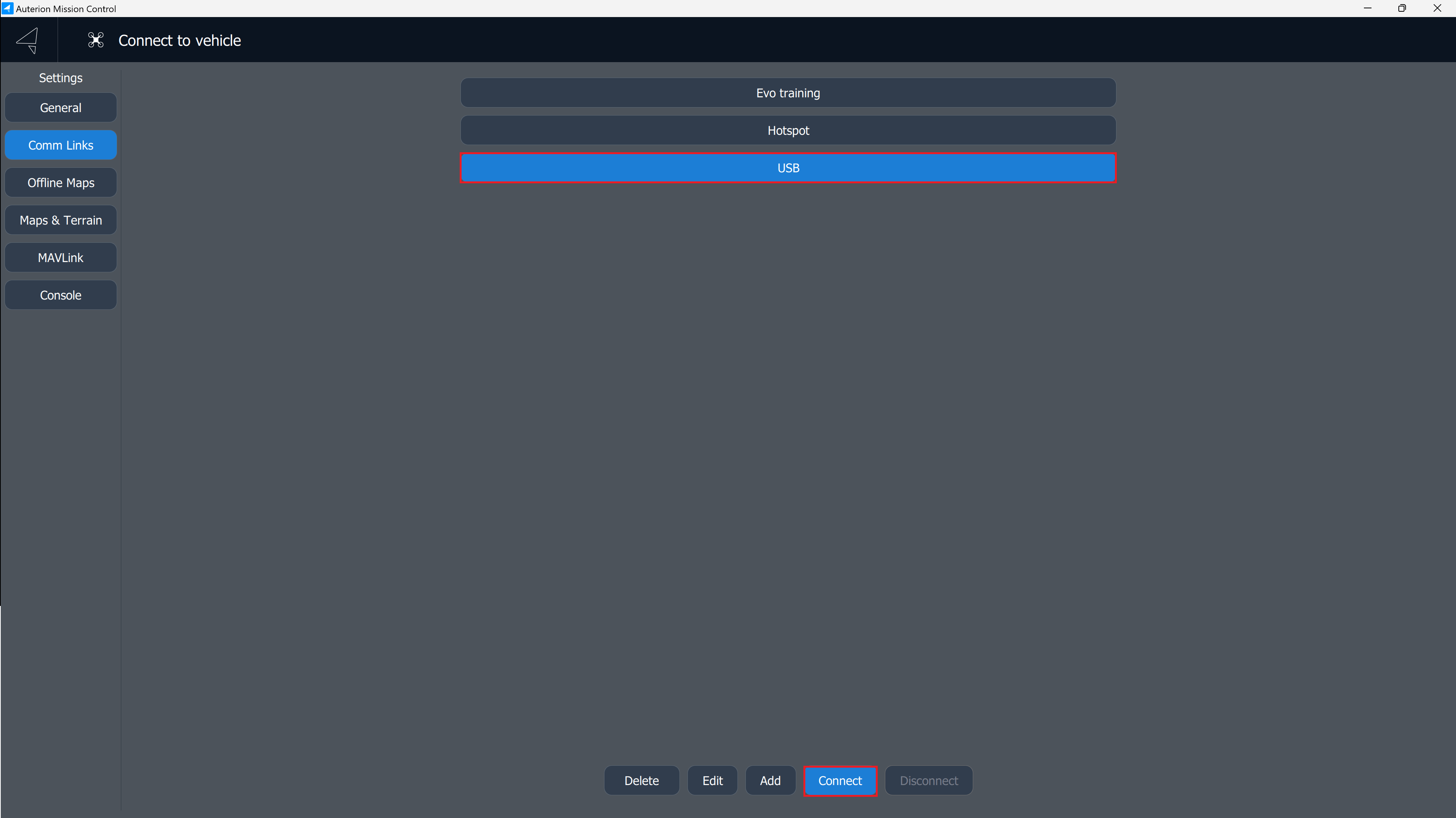 Add a target host, which is the USB IP address displayed in the Evo Control Panel on the DeltaQuad Controller.