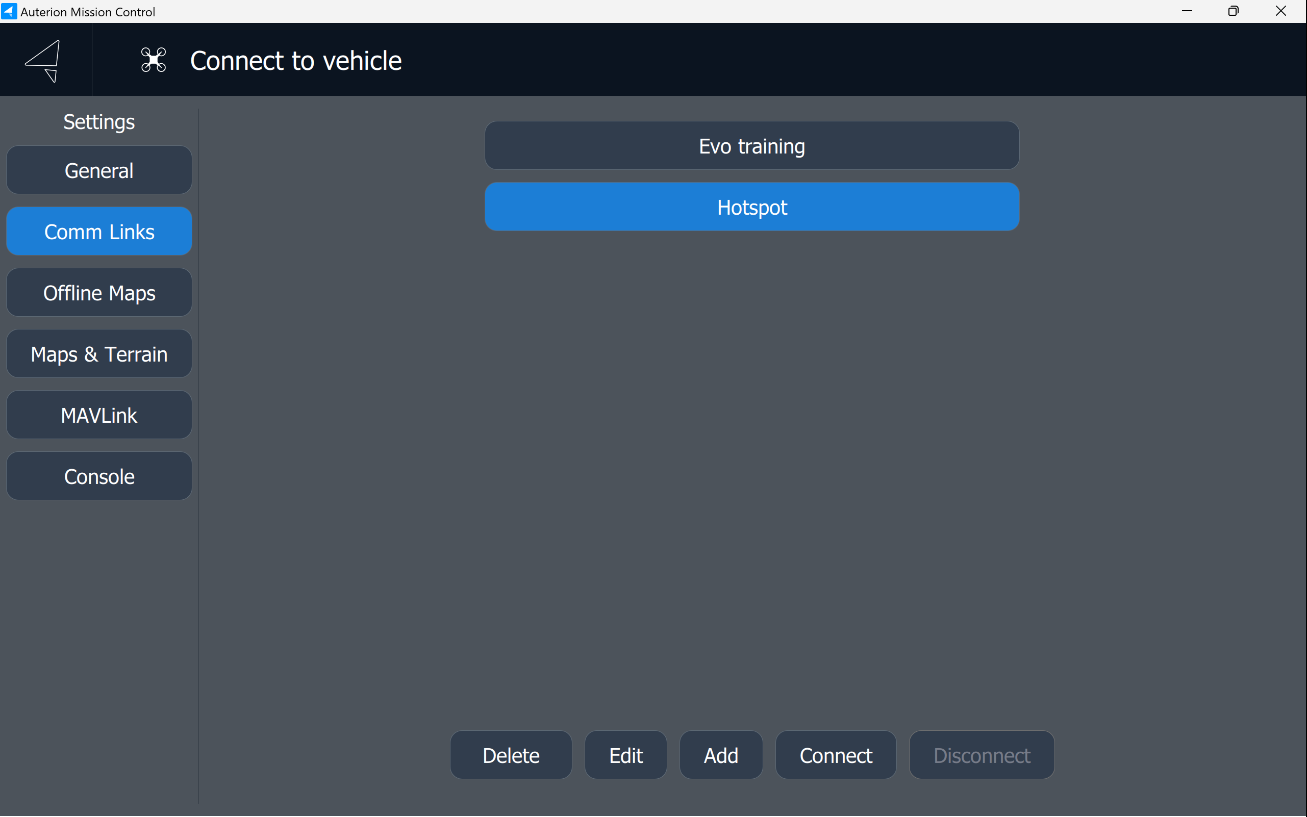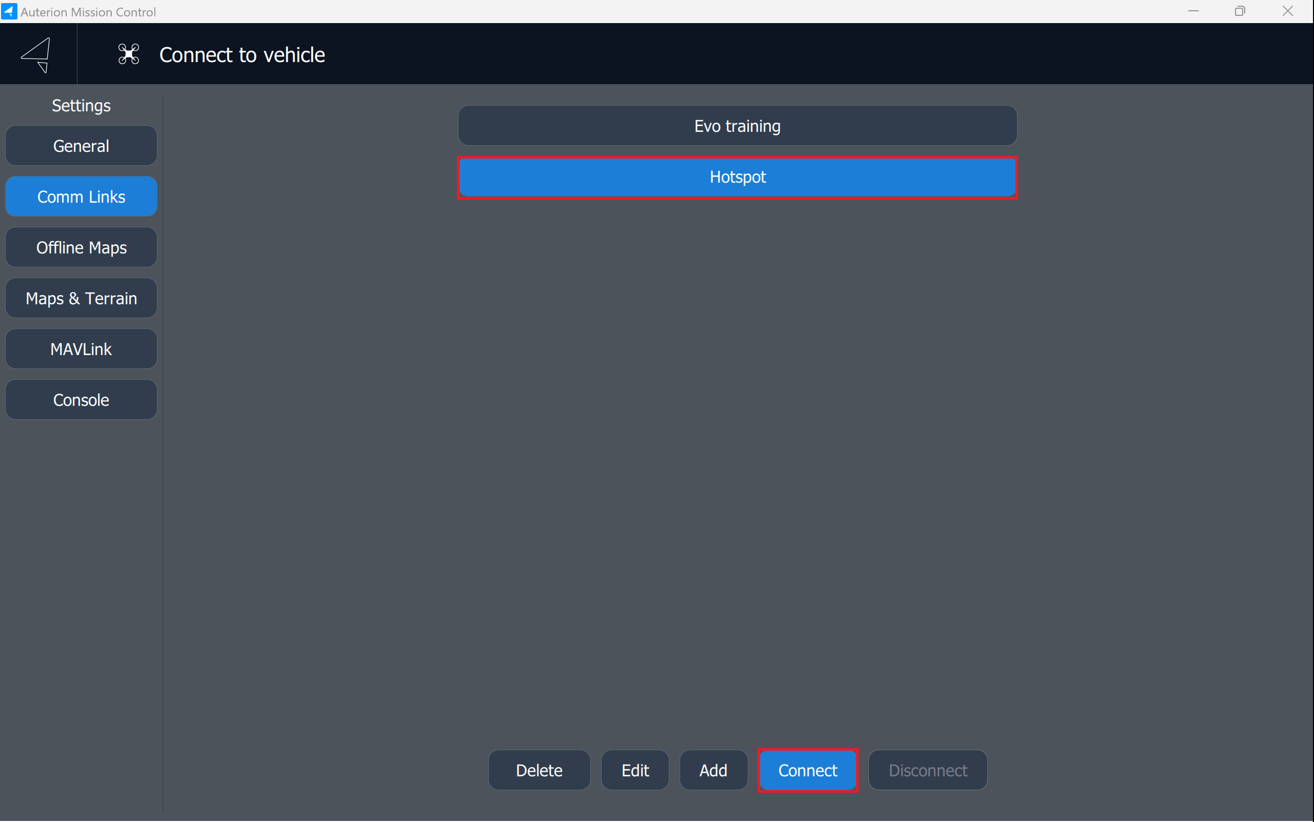 Add a target host which is the WiFi IP address displayed in the Evo Control Panel on the DeltaQuad Controller.