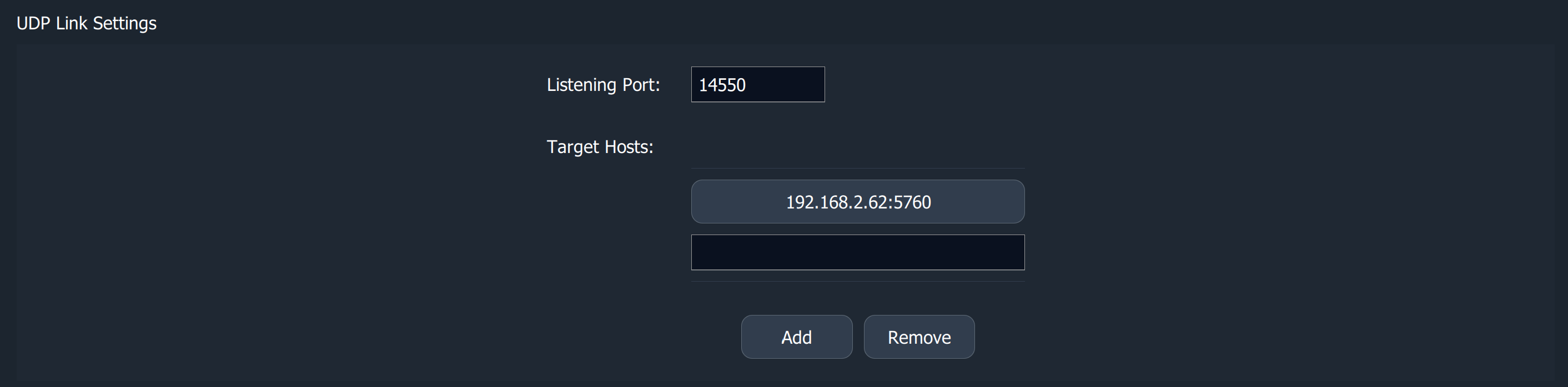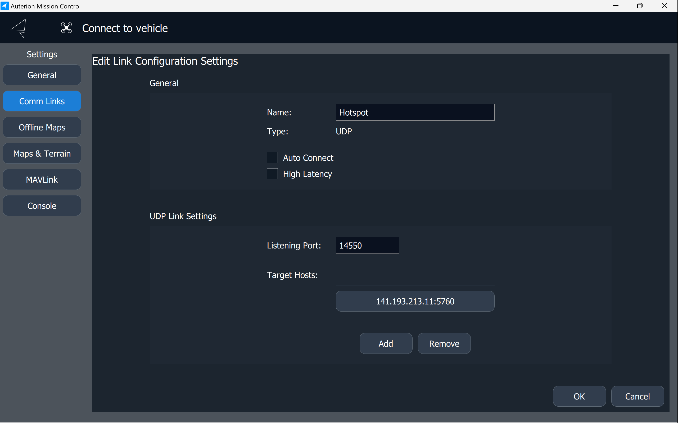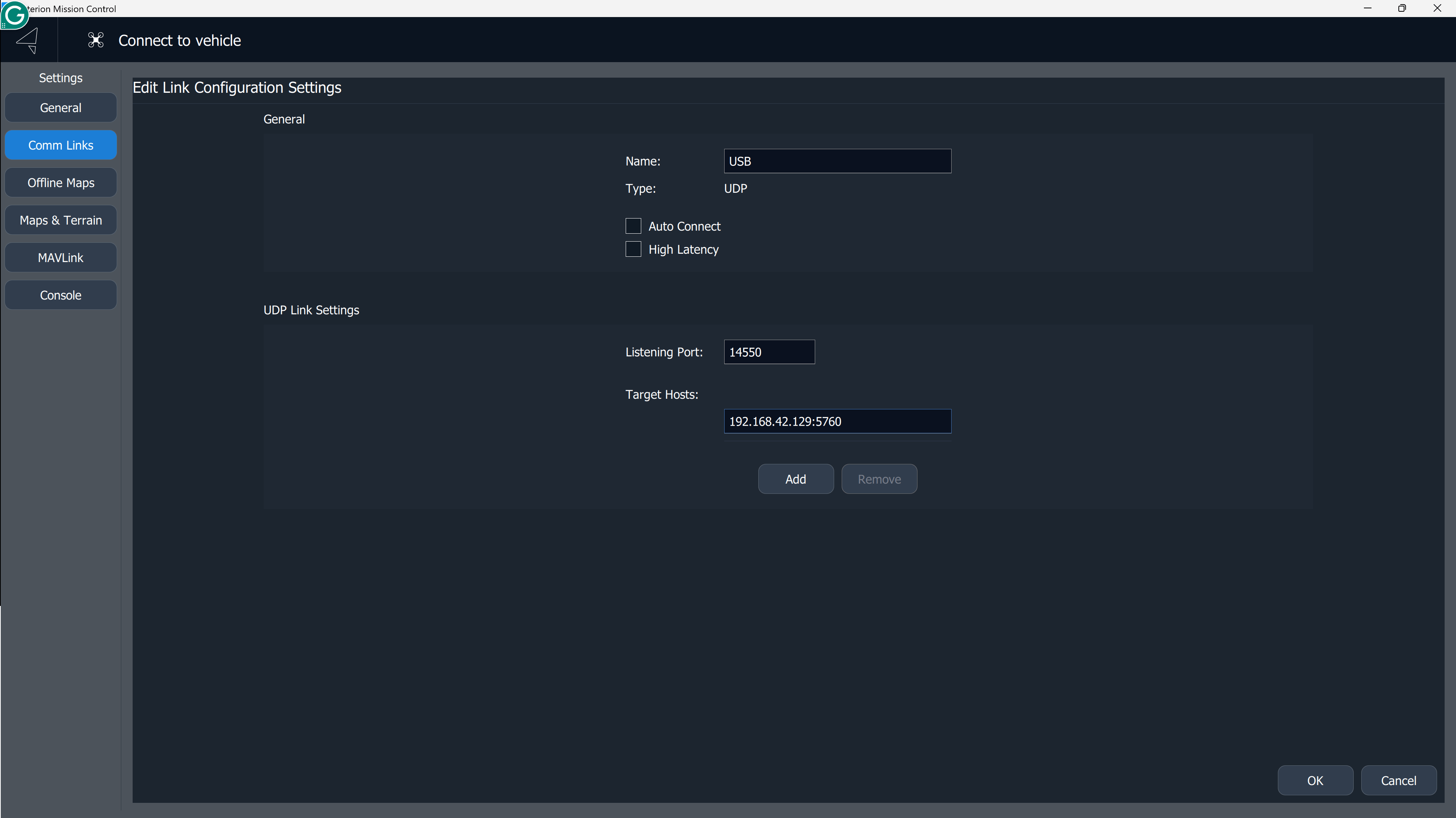 6. Name the Comm Link. Choose UDP as the Type. The listening port is 14550.
