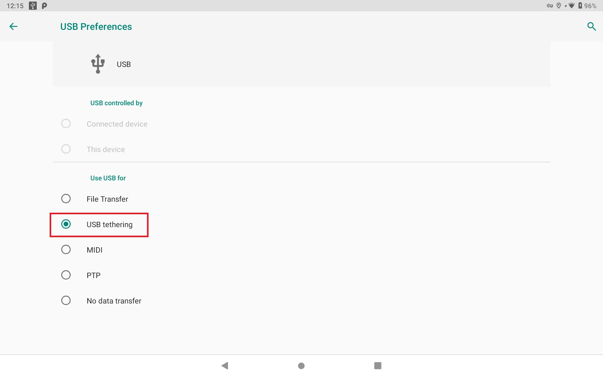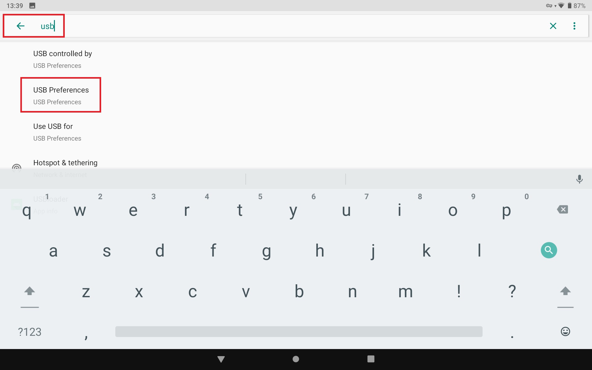 * In the settings menu, search for USB and select USB Preferences.