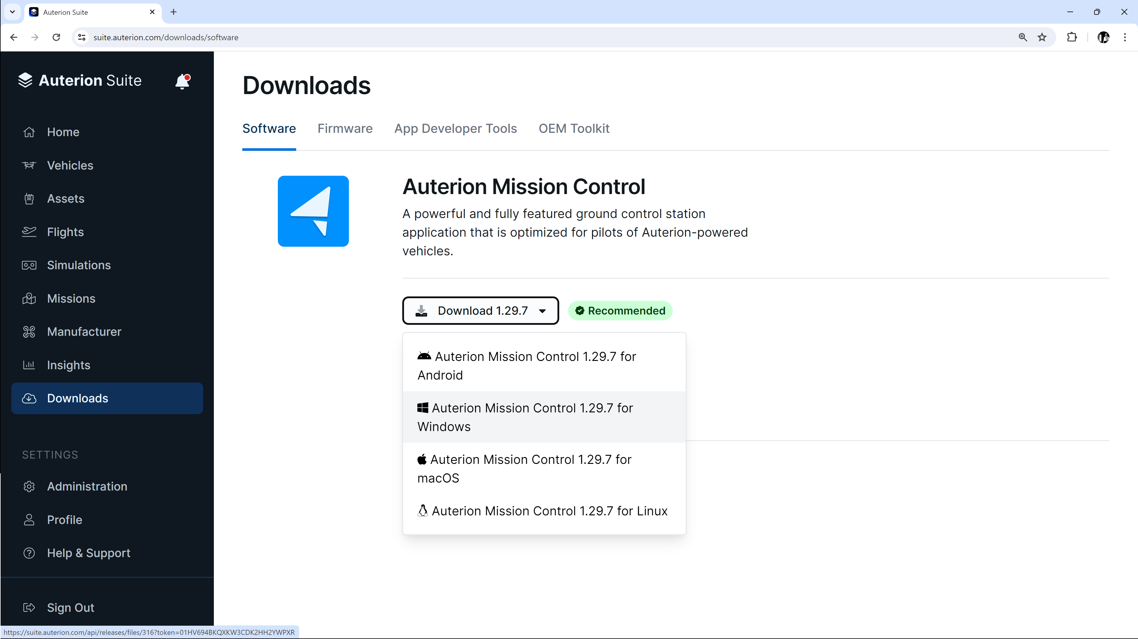 1. Log into your Auterion Suite account on the device of your choice. Select the latest version of AMC and choose your operating system.