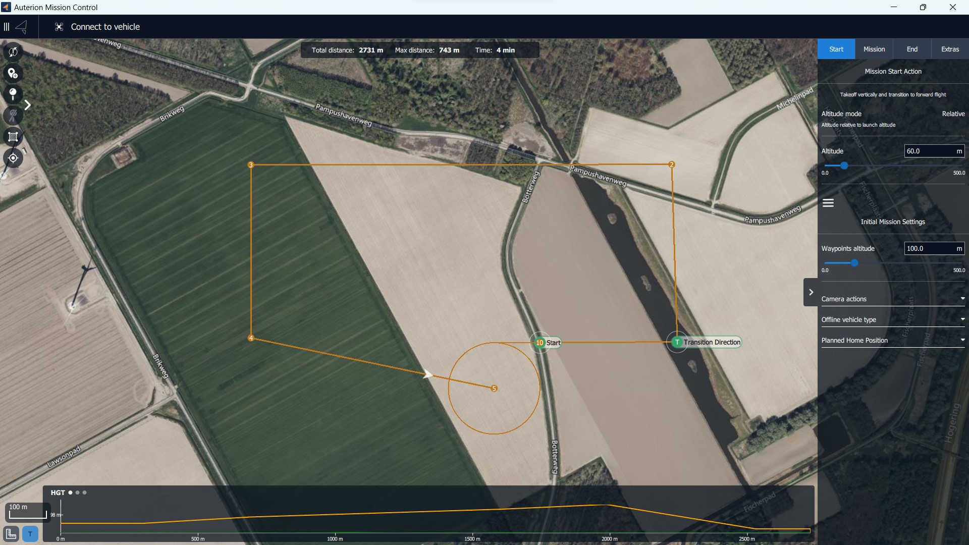 Start: In this tab, you can edit the values of the Mission Start Action which consists of the Start or takeoff item and the Transition Direction item.