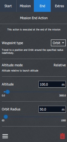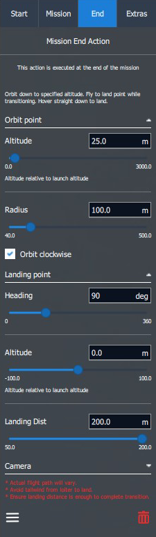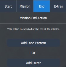 After the waypoints have been placed the Mission End Action has to be planned. When clicking on the End tab within the Plan Item Selector two options are available.