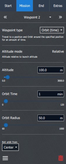 The vehicle flies toward the location and altitude specified by the user. Once it arrives, the vehicle will initiate an orbit and continue to circle that position. When the specified Orbit Time elapses, it will proceed to the next mission item.