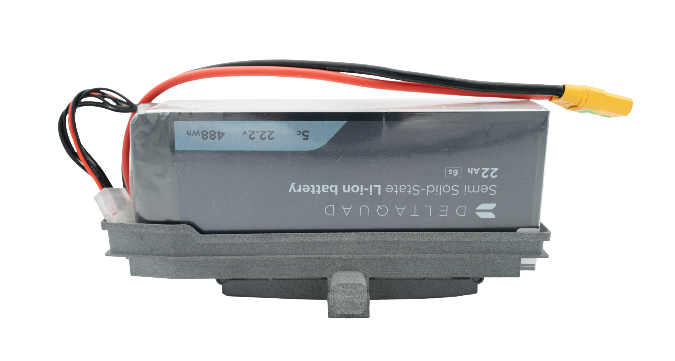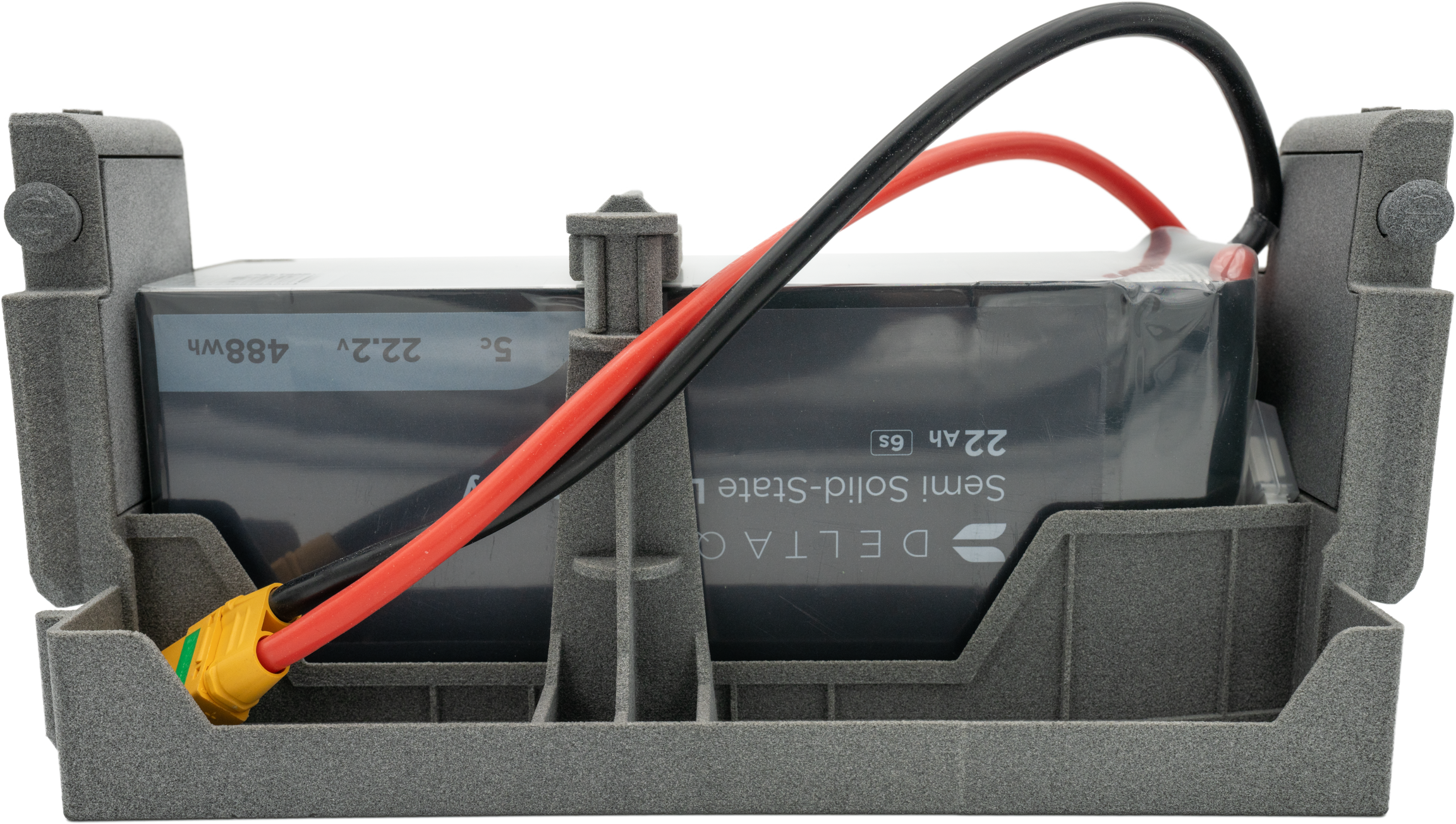 The auxiliary battery must be placed in such a way that it fits on the tray. The thicker power cables must exit the top of the battery and lead over the top of the battery toward the XT90 socket of the DeltaQuad Evo.