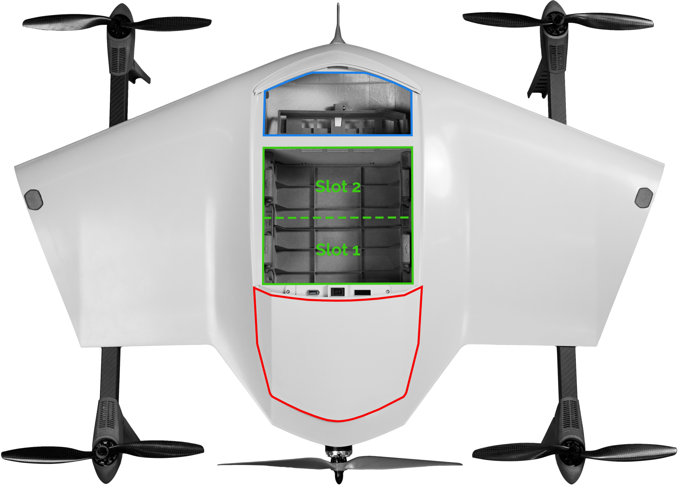 The DeltaQuad Evo has a battery bay (blue), a payload bay (green), and an avionics bay (red).