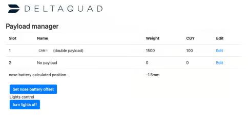 The Payload Manager can be used to verify whether all payloads are registered by the system. Payloads integrated by DeltaQuad are preconfigured and require no additional changes. For Custom Payload Kits, relevant values can be added in the Payload Manager for the respective payload. The nose battery offset is set during production and only needs to be adjusted if hardware in the avionics bay is changed.