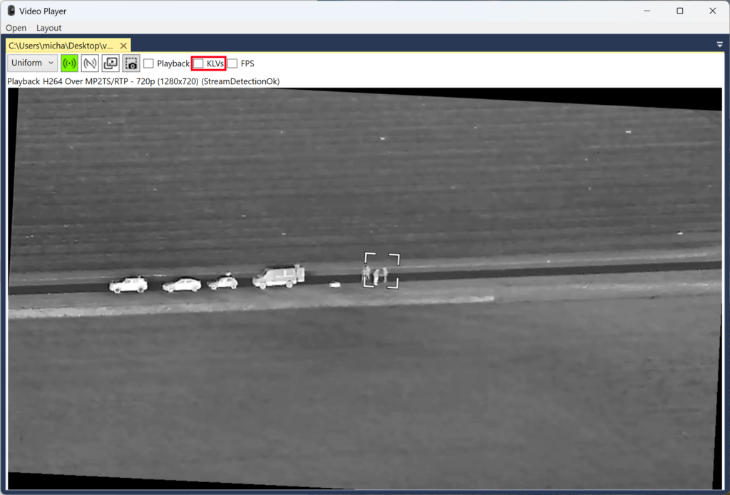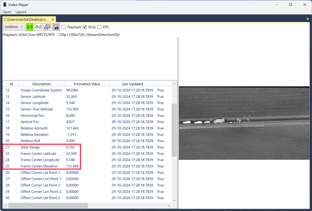 4. The selected video will be displayed in the video player. Enable the **KLVs** option to display the video's metadata.