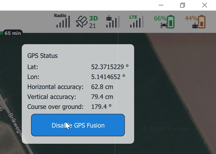 **GPS Fusion** - GPS data is combined with other sensor data to enhance the accuracy and reliability of the drone's navigation and positioning systems. When GPS Fusion is disabled, the vehicle position based on the raw GPS data will be displayed as a **grey arrow** in AMC. The **blue arrow** shows the estimated vehicle position based on the IMU, compass, and wind speed sensor.