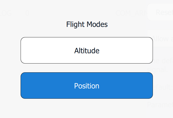 * **Position** mode must be selected for the optical flow sensor to work. The sensor is not available in **Altitude** mode and will function up to 10 meters above ground level. When the vehicle is higher than 10 meters, it will automatically switch to Altitude mode.