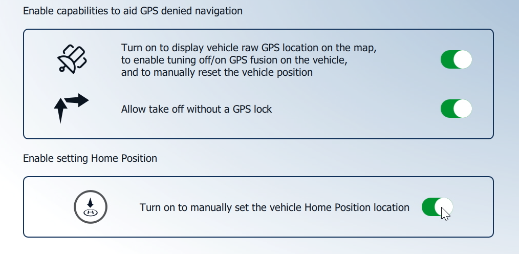 * The functions to disable **GPS Fusion**, set the **Home Position** manually, and allow **takeoff without GPS** lock, must be enabled in **AMC Menu -> Vehicle Overview -> More -> GPS Advanced Settings**.