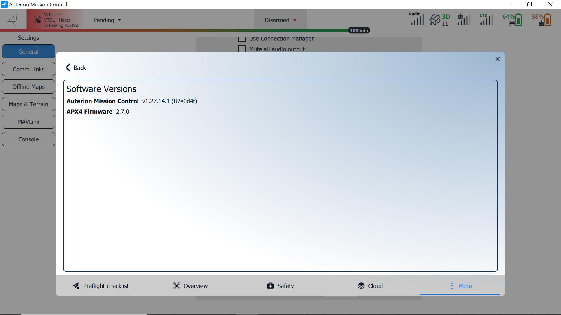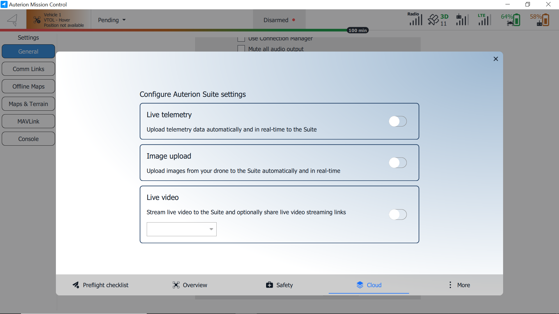**Auterion Suite** provides advanced connected vehicle features for the DeltaQuad Evo. To access these settings, click on the **Cloud** icon at the bottom of the **Vehicle Overview** window.