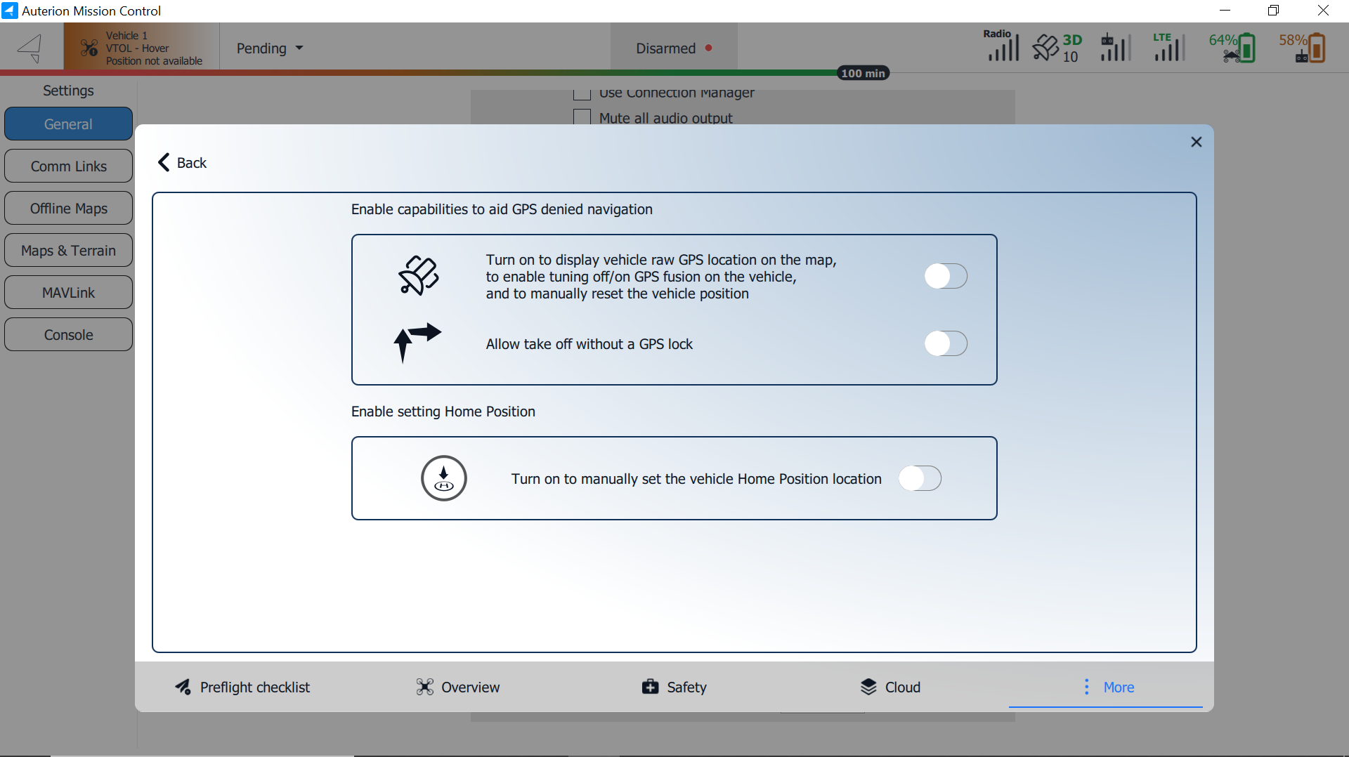 <table data-header-hidden><thead><tr><th width="164"></th><th></th></tr></thead><tbody><tr><td><img src="https://2001386943-files.gitbook.io/~/files/v0/b/gitbook-x-prod.appspot.com/o/spaces%2FWRJBD0tISFQunPjBDz6c%2Fuploads%2FJl7mZkv8DiD40SAv6ZJv%2FGPS%20symbol.webp?alt=media&#x26;token=146a4982-6657-4717-b99e-39409302be6f" alt="" data-size="original"></td><td>Enable this setting to display the vehicle's raw GPS location (indicated by a gray arrow) on the map, toggle <strong>GPS Fusion</strong> on or off, and manually reset the vehicle's position.</td></tr><tr><td><img src="https://2001386943-files.gitbook.io/~/files/v0/b/gitbook-x-prod.appspot.com/o/spaces%2FWRJBD0tISFQunPjBDz6c%2Fuploads%2FgQ2TNZ6SazKjE2d0RbCG%2FTakeoff.webp?alt=media&#x26;token=0cacafe2-2624-49d1-9b2a-8130165d23d2" alt="" data-size="original"></td><td>Permit takeoff without a GPS lock.</td></tr><tr><td><img src="https://2001386943-files.gitbook.io/~/files/v0/b/gitbook-x-prod.appspot.com/o/spaces%2FWRJBD0tISFQunPjBDz6c%2Fuploads%2FqAWYt6go3oRMTq3RESCe%2FHome%20point.webp?alt=media&#x26;token=c4862893-af5f-46cc-a30e-10b6e37413c4" alt="" data-size="original"></td><td>Enable this setting to manually set the vehicle's Home Position.</td></tr></tbody></table>