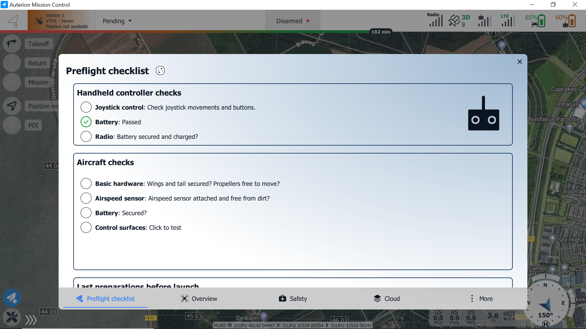 The interactive **Preflight Checklist** in AMC can be accessed by clicking the icon in the lower-left corner of the **Vehicle Overview** window. This checklist must be completed before every flight, as it is an integral part of the **Pre-flight Checks** outlined in this [manual](https://docs.deltaquad.com/tac/flight/pre-flight-checks).