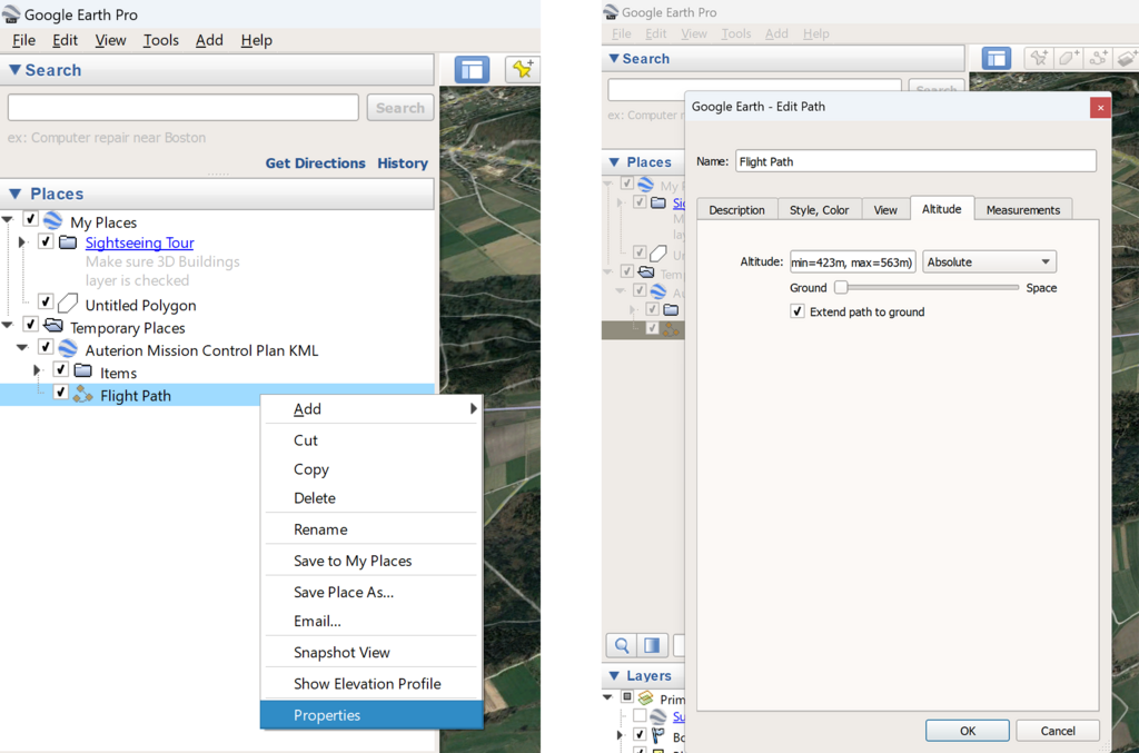 The flight path can be extended to the ground to visualize the space between the mission altitude and the ground. In Google Earth, select the Flight Path -> Properties -> Altitude -> check Extend path to ground.