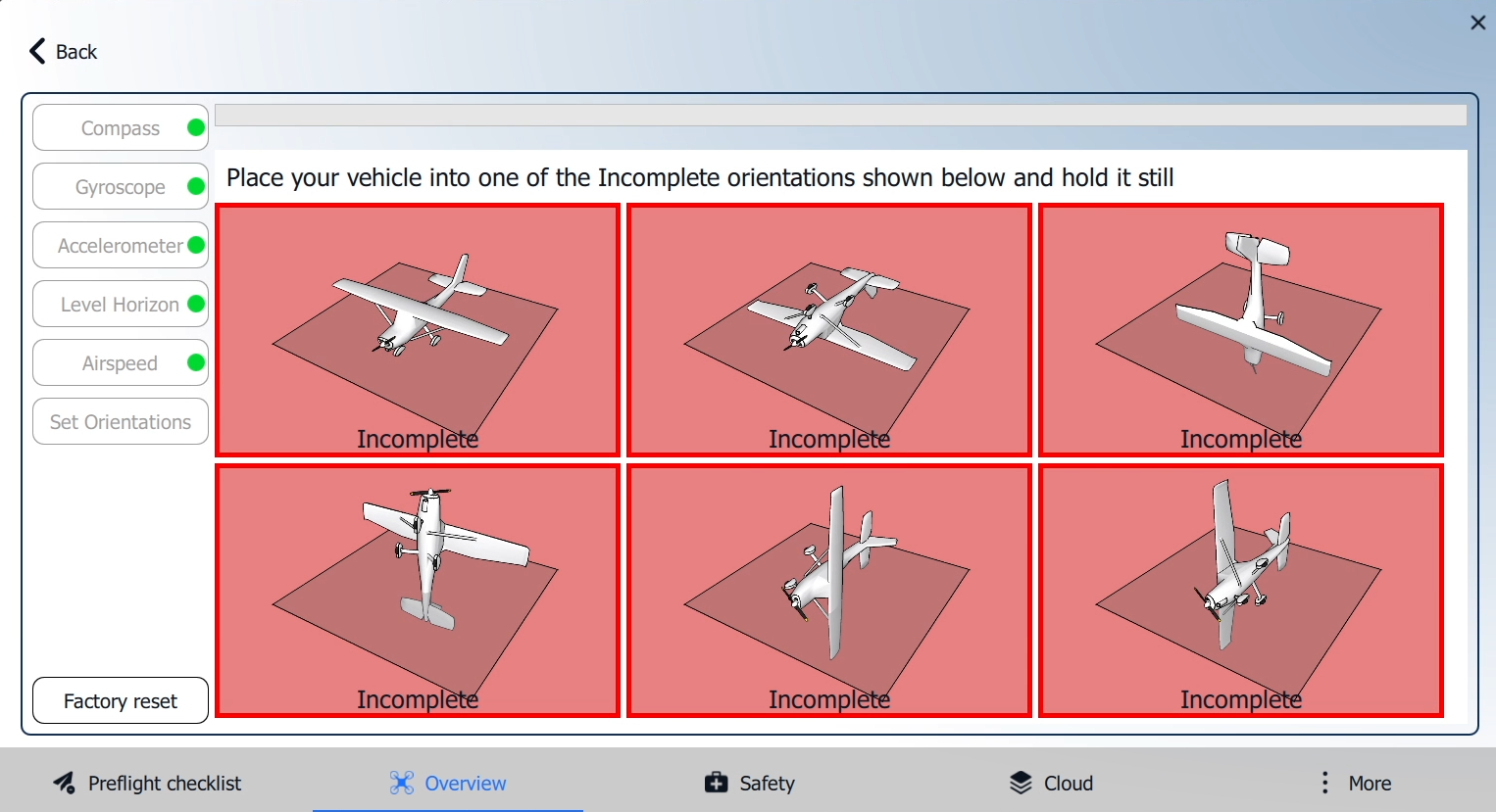 3. AMC will guide you in positioning the vehicle in a series of set orientations and then rotating it around the specified axis. Place the vehicle in any of the orientations shown in red (incomplete) and hold it still.&#x20;