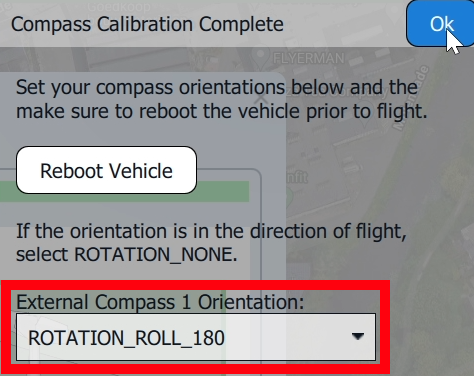 7. Once you've calibrated the vehicle in all positions, AMC will display a **Compass Calibration Complete** prompt. Verify the **External Compass 1 Orientation**.