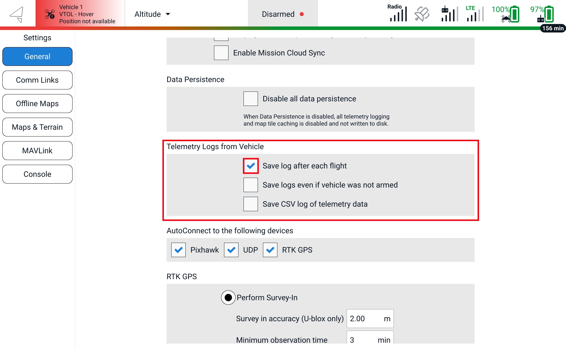 Basic telemetry logging in AMC is enabled by default. To disable it, open AMC, go to **AMC Menu -> Settings -> General**. Under **Telemetry Logs from Vehicle** disable **Save log after each flight.**