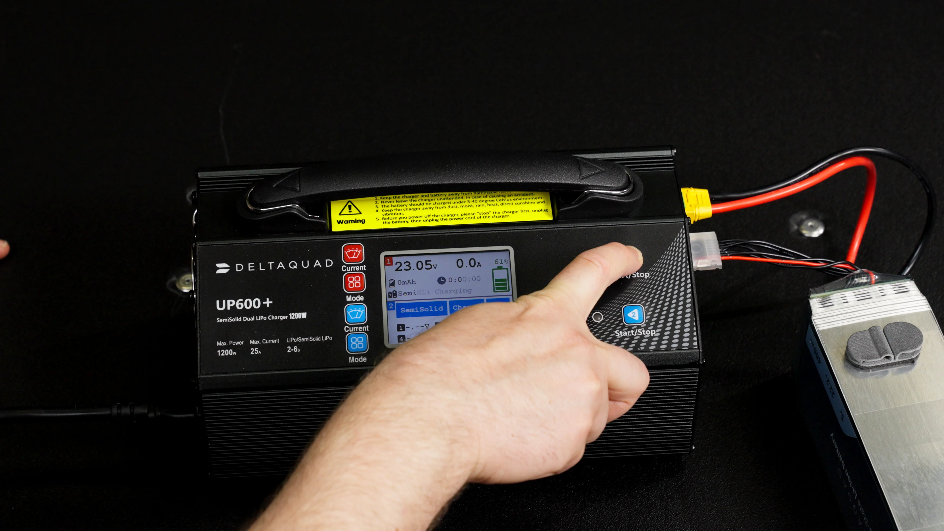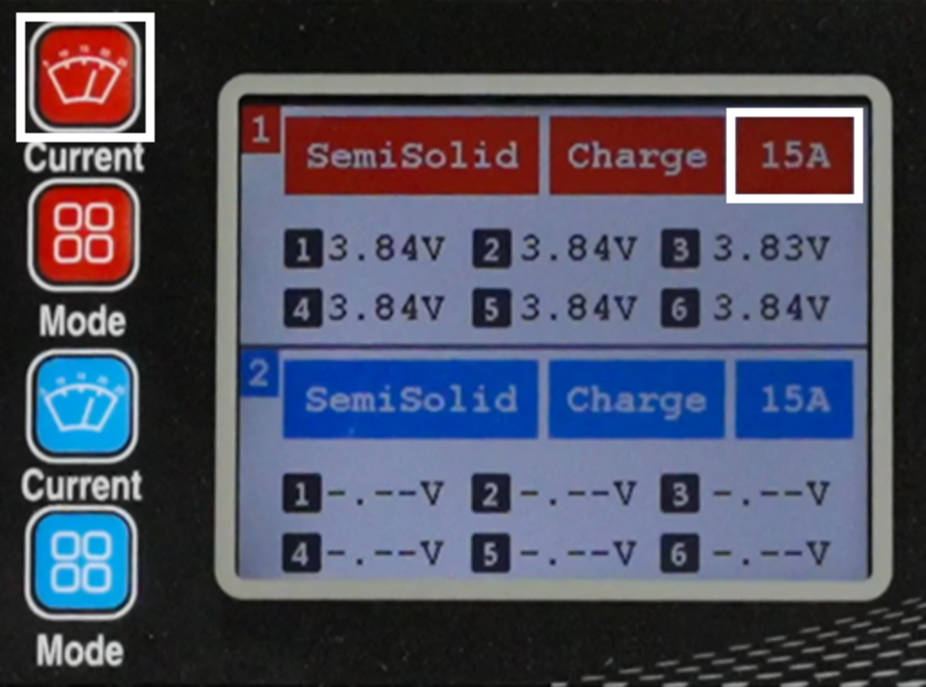 * We recommend charging the DeltaQuad Evo batteries at a rate of **10 to 15 amperes**. You can adjust the charging current by cycling through the available values using the current button.