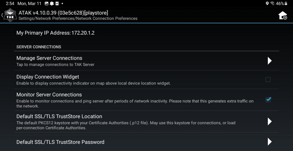 3. In ATAK, click on the three dots in the top right. A menu will appear. Click on **Settings** and then **Network Connections**. A popup will appear. Click on **Network Connections**. Check that the **Primary IP Address** is in the range **172.20.XX.XX**.