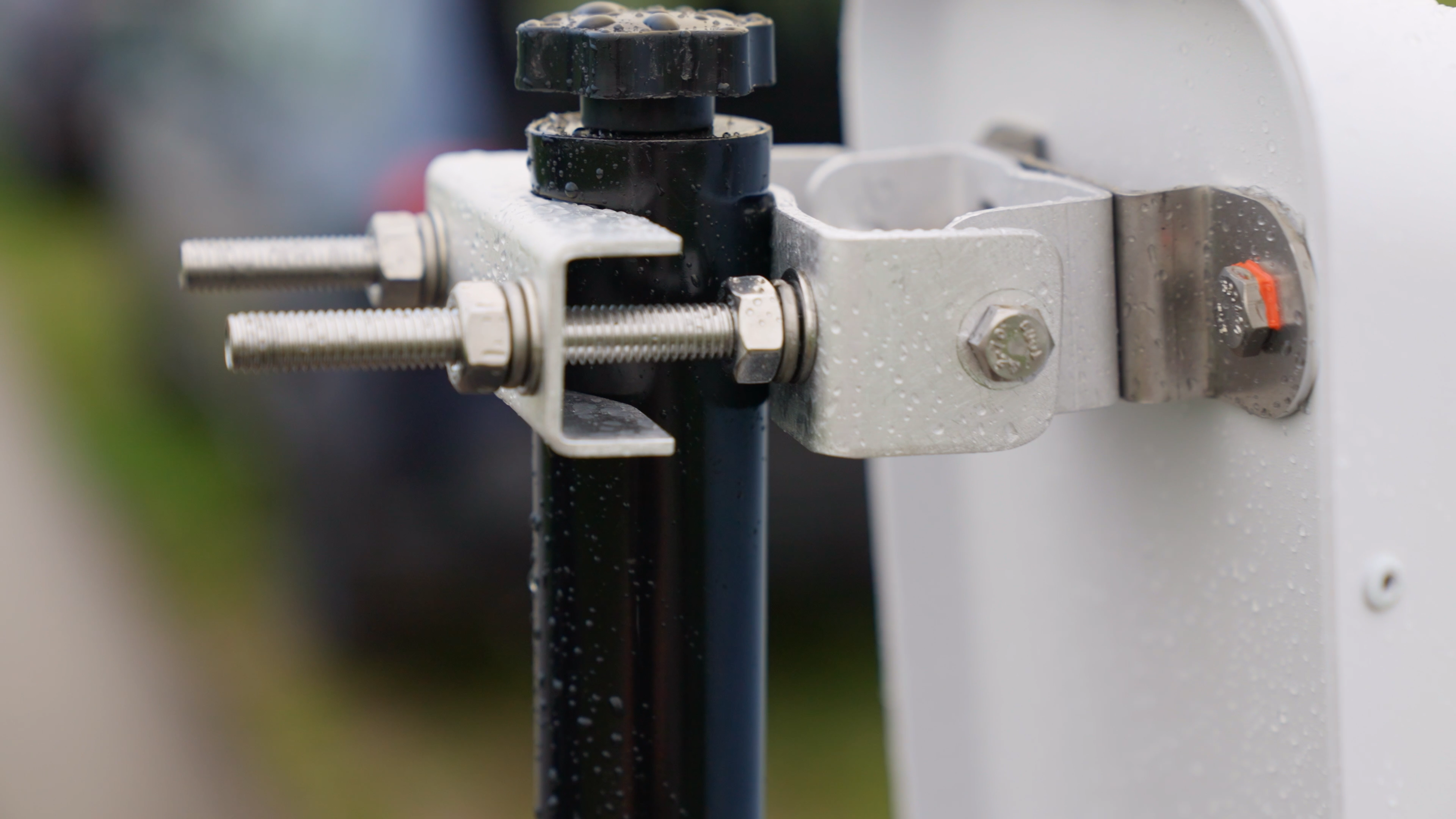 * The vertical angle of the sector antenna can be changed by adjusting the lower extender arm. It features a degree scale for precise adjustments.